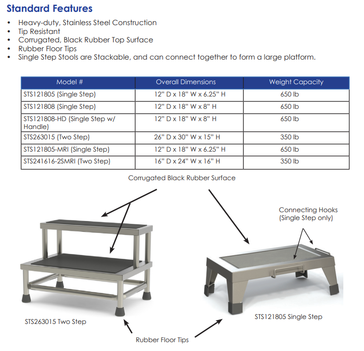 Diseñados pensando en la seguridad, nuestros taburetes médicos son resistentes y antivuelco. Los taburetes de un solo peldaño se pueden conectar entre sí para crear una plataforma amplia y segura. El carrito de transporte opcional permite transportar y almacenar fácilmente hasta 5 taburetes de un solo peldaño.